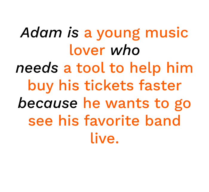 Then I proceeded to create a problem statement and design a persona to represent the target users, which usually struggled with the time they spent waiting to buy their tickets. Another big issue was that the pages would usually lag and close due to the high amount of traffic.