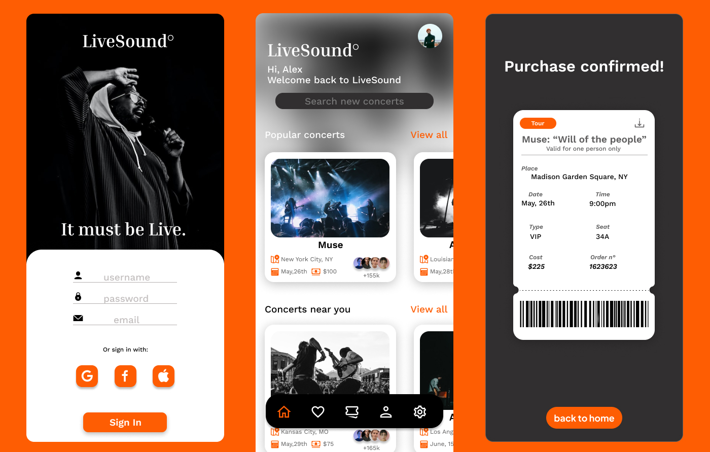 LiveSound is a dedicated app designed to make music lovers' lives easier. LiveSound is a centralized platform where the user can browse different music-related events and book tickets directly through the app. The user flow is really simple and intuitive to make the whole buying process faster for the user, the app also features a digital ticket library where the user can find all the tickets and scan them directly with their phone.